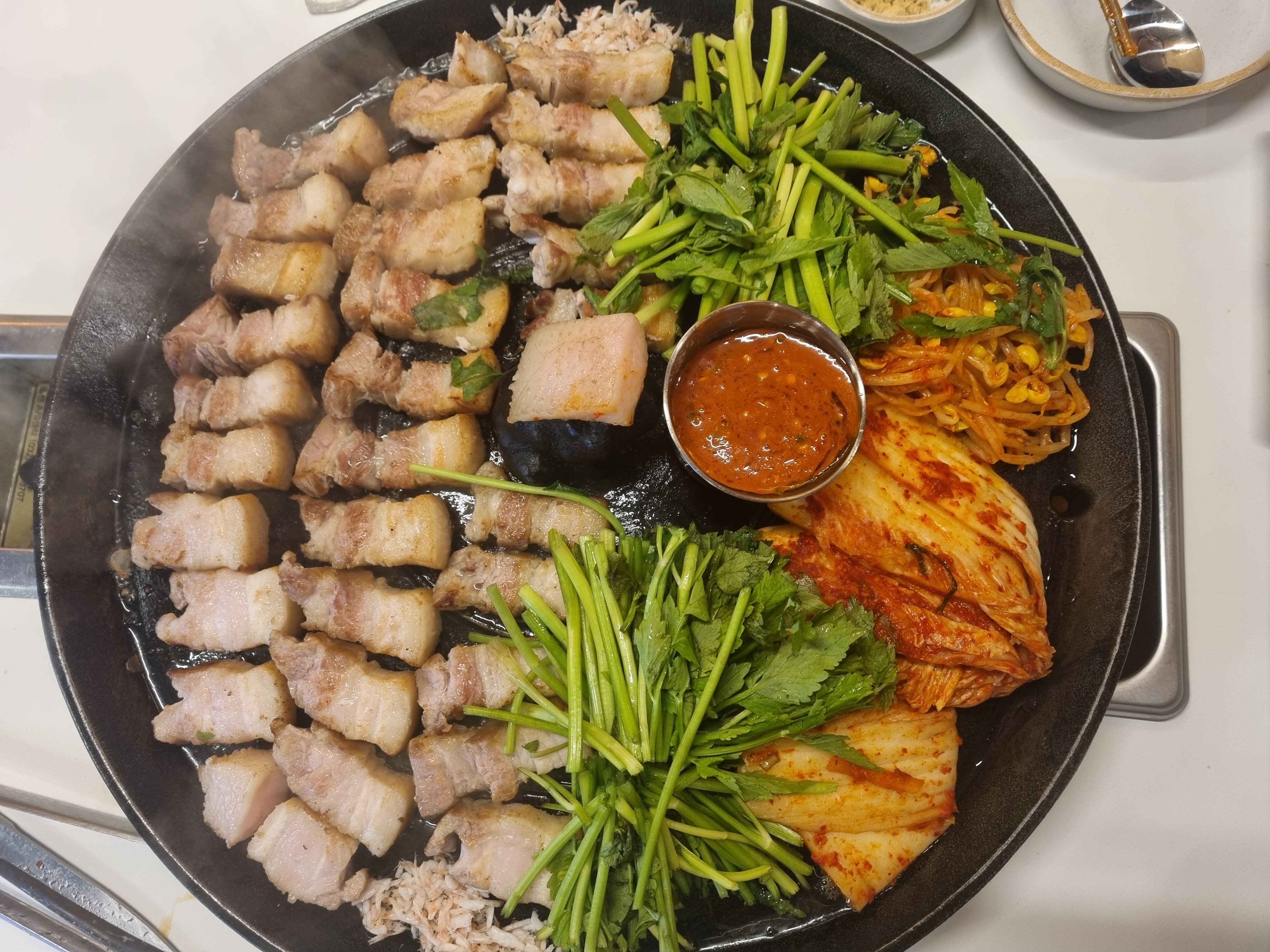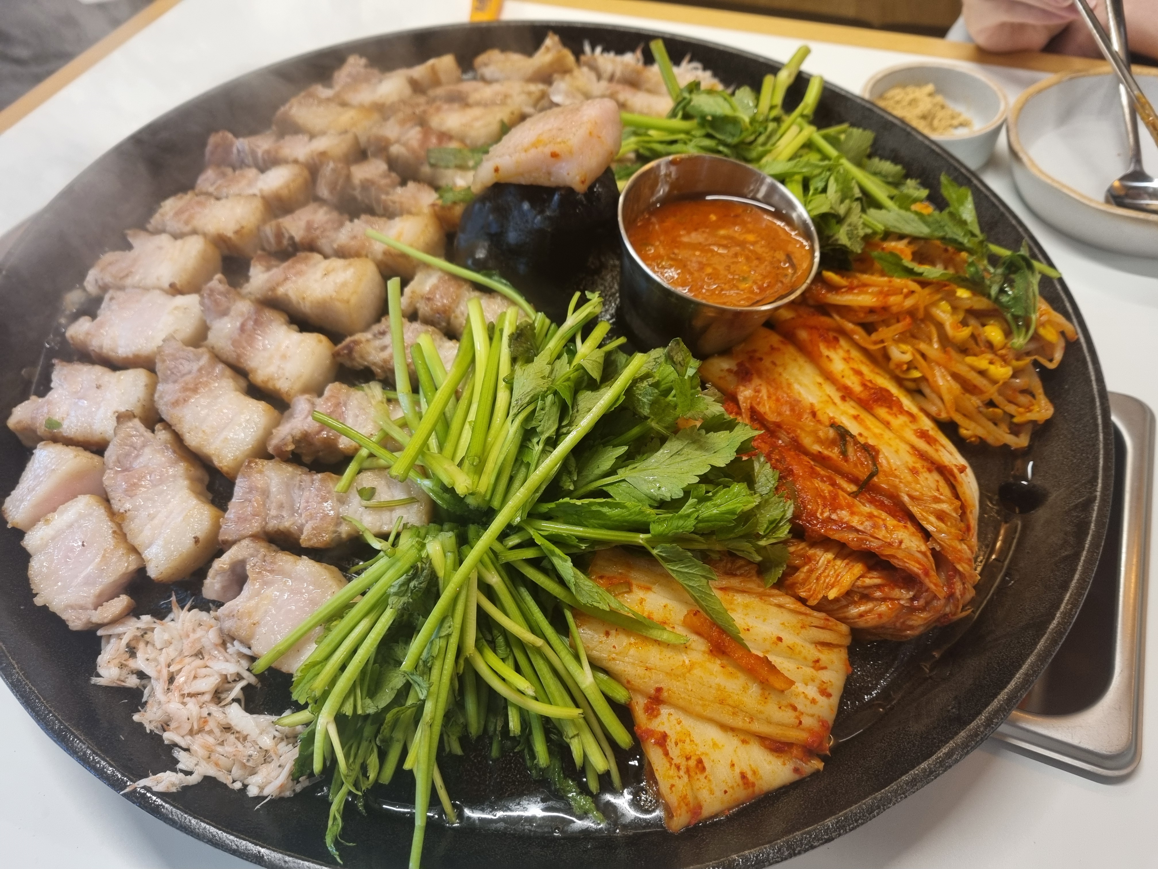 삼겹살 : 콩가루+고랭지 김치+파채