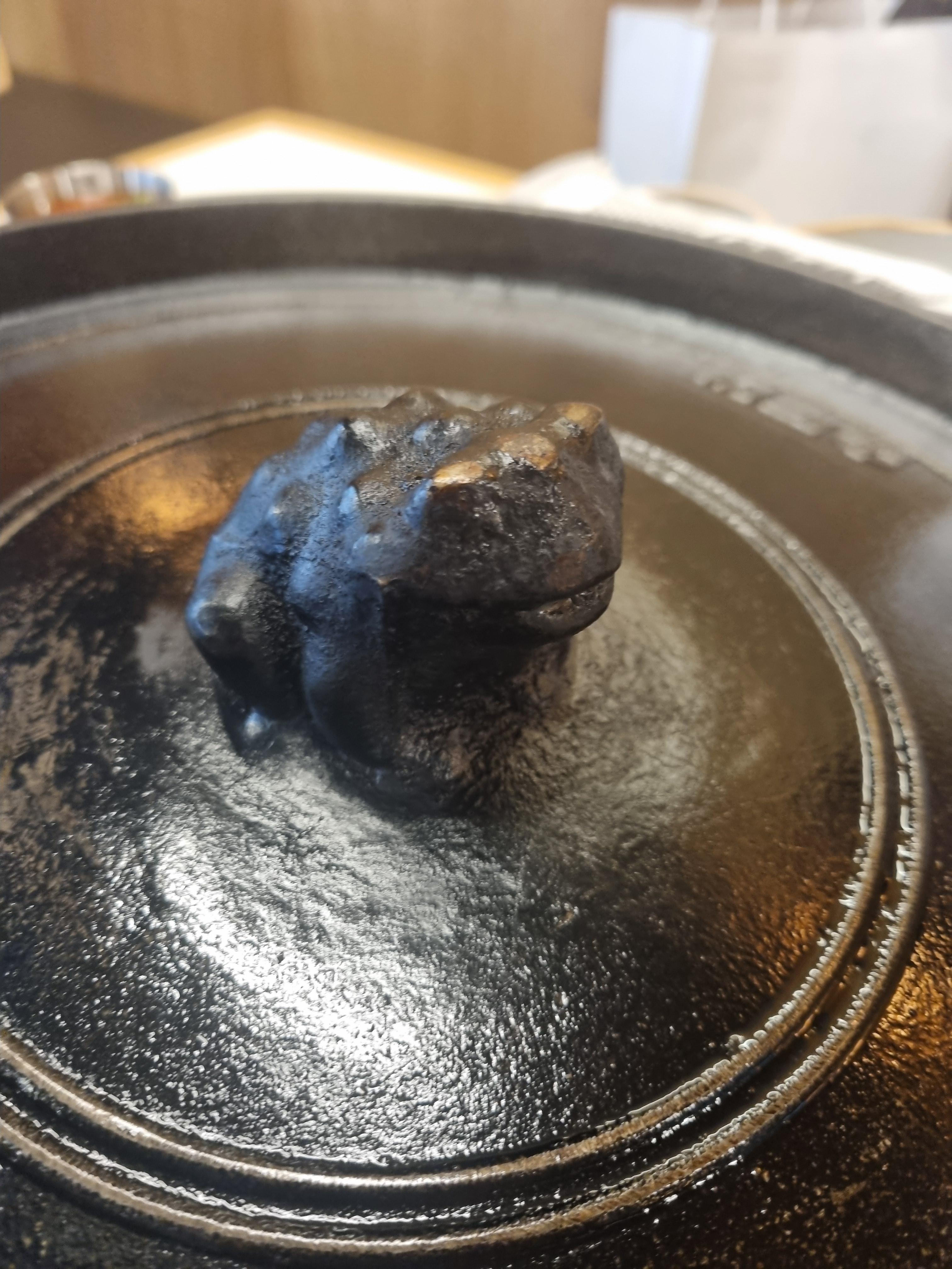 솥뚜껑에 고기를 구워 먹습니다. 솥뚜껑 가운데 두꺼비가 있네요.