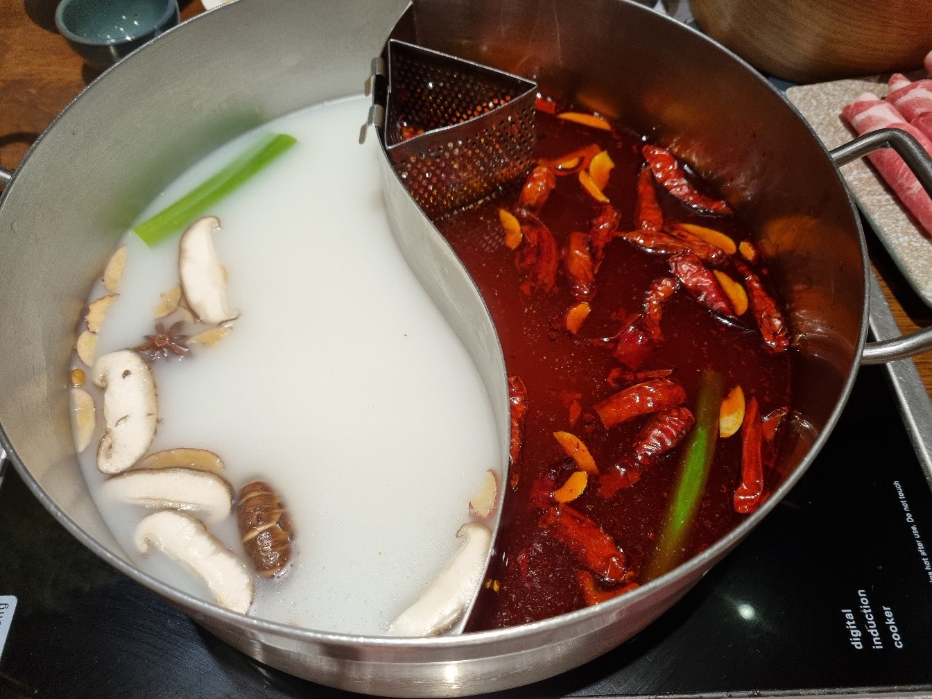홍탕과 버섯탕 반반으로 시켰습니다. 매운 거만 먹으면 속이 아플 거 같아 함께 했는데 궁합이 찰떡이었습니다.