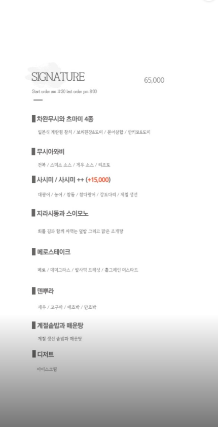 시그니쳐코스는 매달 달라지는 요리 위주의 오마카세입니다.