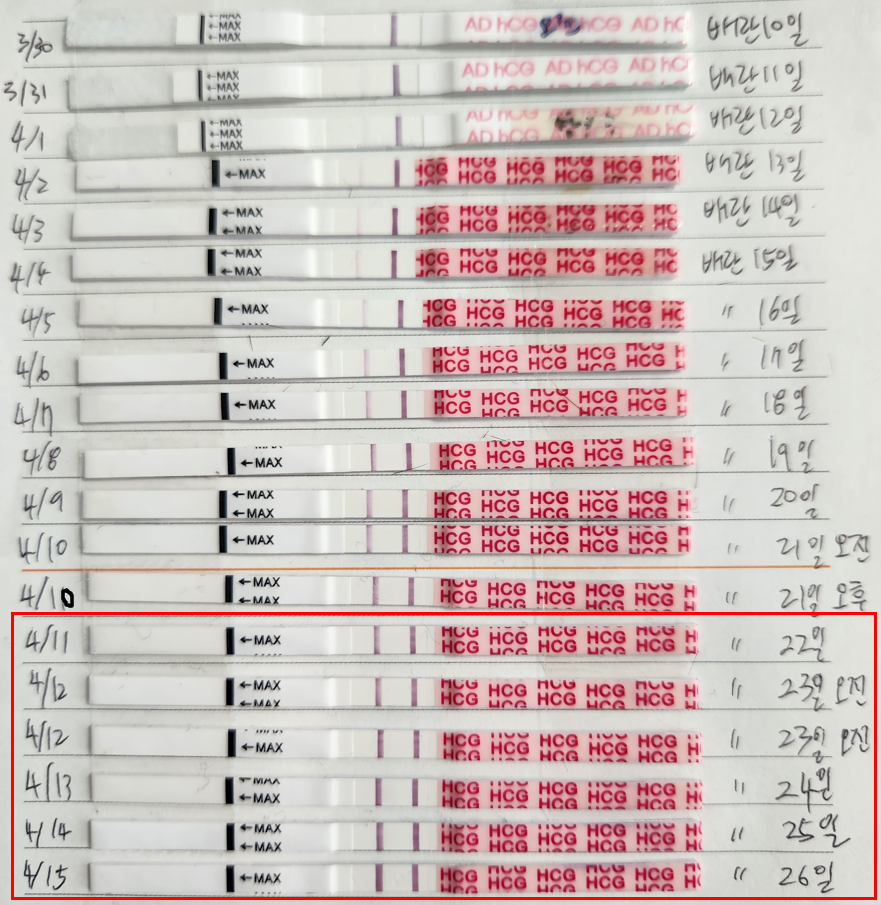 배란 22일차, 23일차, 24일차, 25일차, 26일차 원포 임테기 진하기 비교 졸업 인공수정 후 첫 임테기 역전 뜻